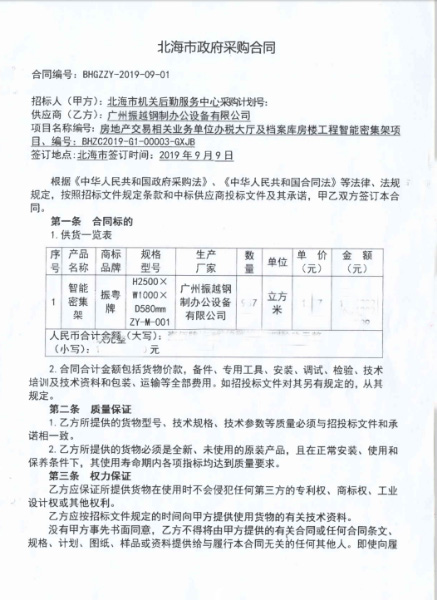 因此想采購一批智能密集架、想詢找廣西或廣東生產(chǎn)密集架的廠家, 并有智能電動密集架資質的公司2019年8月份進行公共投標,通過激烈的競標甄選,最終篩選了我們公司,廣州振越公司生產(chǎn)的智能檔案密集架。